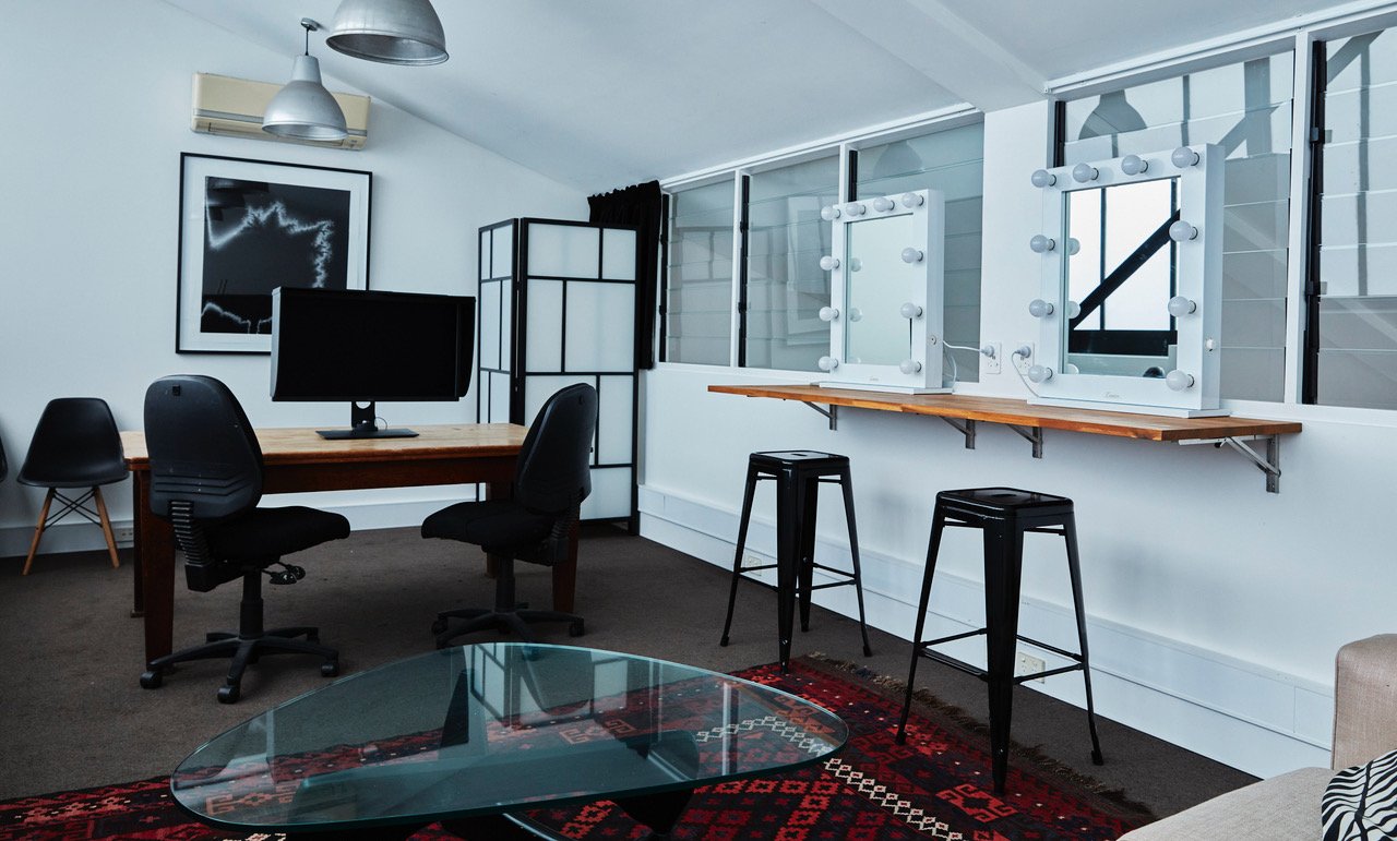 Flexible upstairs breakout area for clients, production office. Make-up mirrors, calibrated monitor for edit suite, colour grading etc.